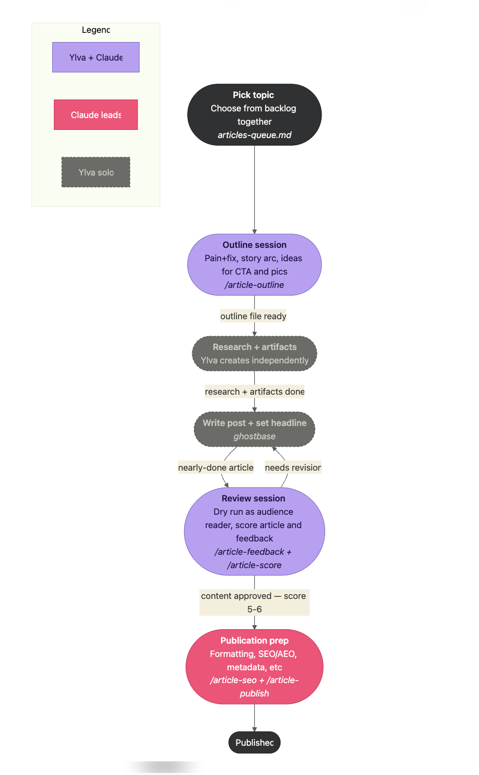 It's one of my core weekly workflows, it has high impact, and it's supporting a skill I'm actively building. Each box in the diagram is paired with details on what artifacts go in and out, any Claude skills I'll use (Create a skill using this article) plus bullets (kept in the same file depicting the workflow) for what happens in that step. Creating this overview has truly helped me: